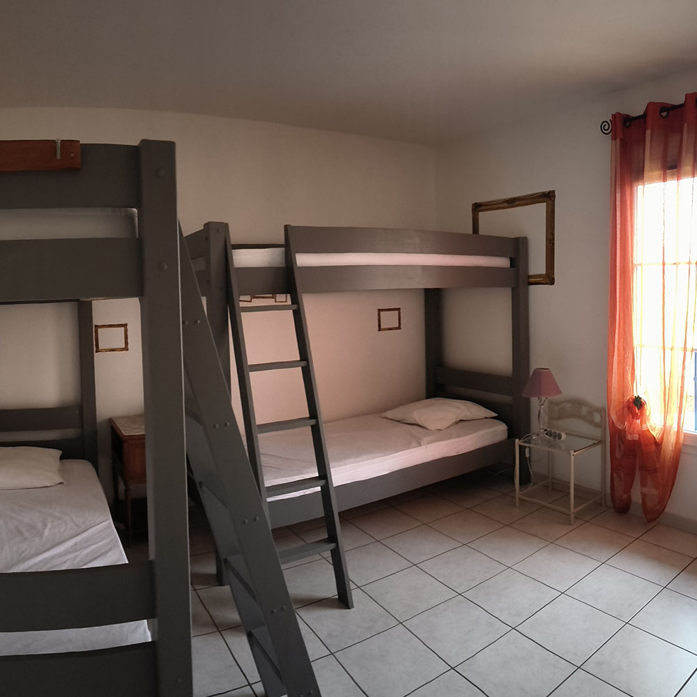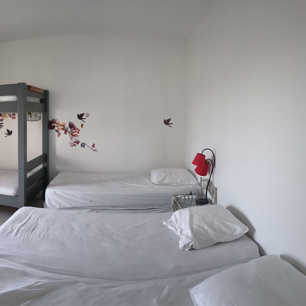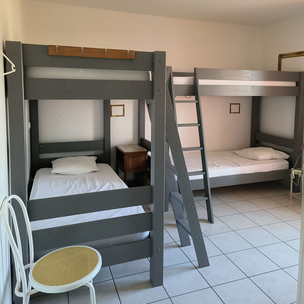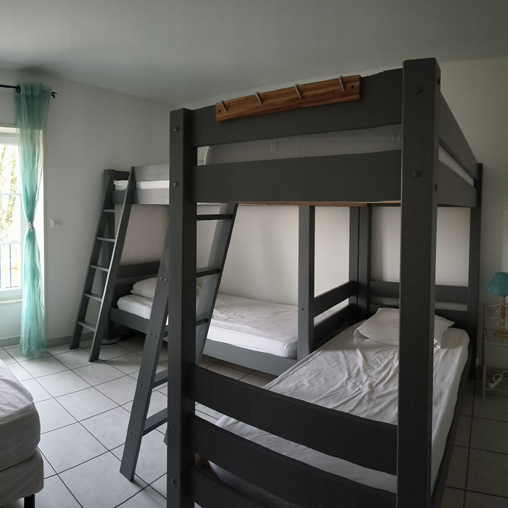 6 personnes, 2×3 lits superposés, couchages individuels ( dimensions 90cm x 190cm ) Salle de bain